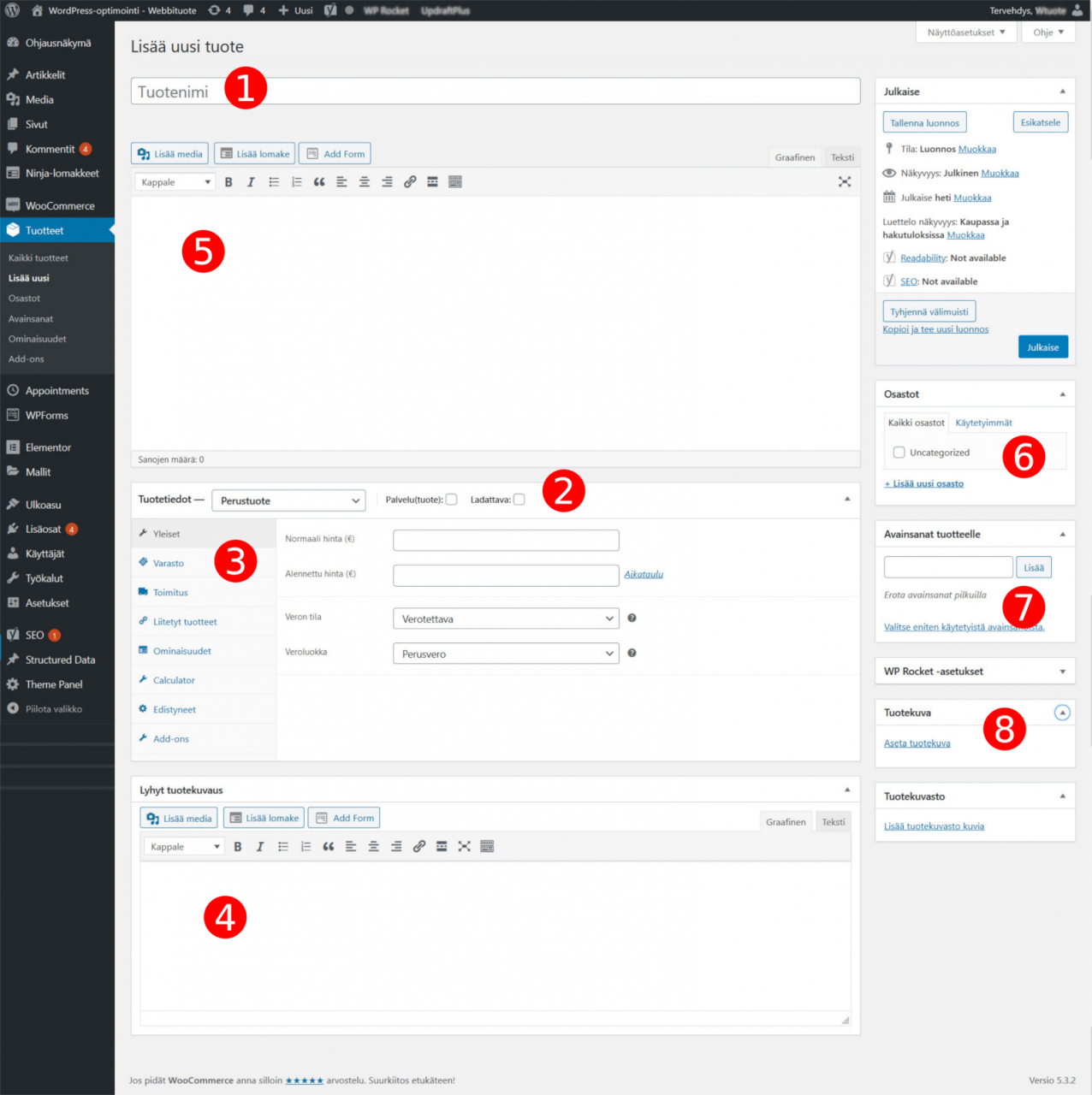 Kirjaudu sisään WordPressin hallintapaneliin, sekä avaa “Tuotteet” -valikon alta “Lisää uusi”. Tämän jälkeen eteesi aukeaa alla näkyvä tuotteen hallintasivu, johon tarvittavat tuotetiedot syötetään.