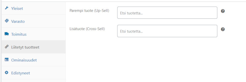 WooCommerce esittää yksittäisen tuotteen sivulla ehdotuksia muista tuotteista (Parempi tuote / Up-Sell). Liitetyt tuotteet -välilehdellä voidaan valitut tuotteet esitettäväksi.