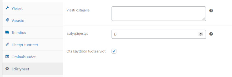 Tuotearviot voi poistaa tässä käytöstä tuotekohtaisesti, muutoin seurataan WooCommerceen määritettyjä yleisiä asetuksia.