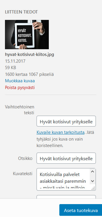 HUOM: Nimeä kuva asiallisesti ennen sen lataamista sivustolle. Anna tuotteelle kuvaava nimi sekä vaihtoehtoinen teksti, jotta hakukoneet ymmärtävät mistä kuvassa on kysymys.