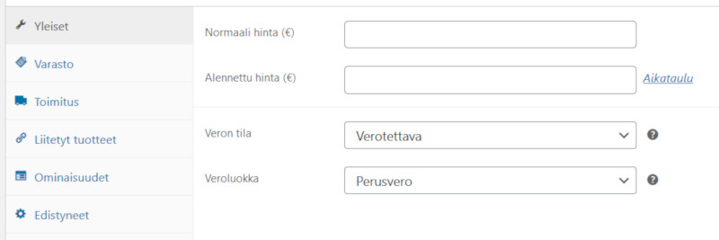 Tälle välilehdelle annetaan tuotteen hinta- sekä verotustiedot. Normaali hinta tulee asettaa aina, alennettua hintaa käytetään silloin kun tuote asetetaan alennusmyyntiin.