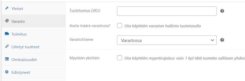 Varasto-välilehdellä annetaan tuotetunnus, sekä määritetään saatavuustiedot. Oletuksena tuotetta on varastossa ilman varastosaldoa. Halutessasi voit asettaa tuotteiden määrän varastossa, sekä rajoittaa tuotteen saatavuutta yhteen kappaleeseen per tilaus.