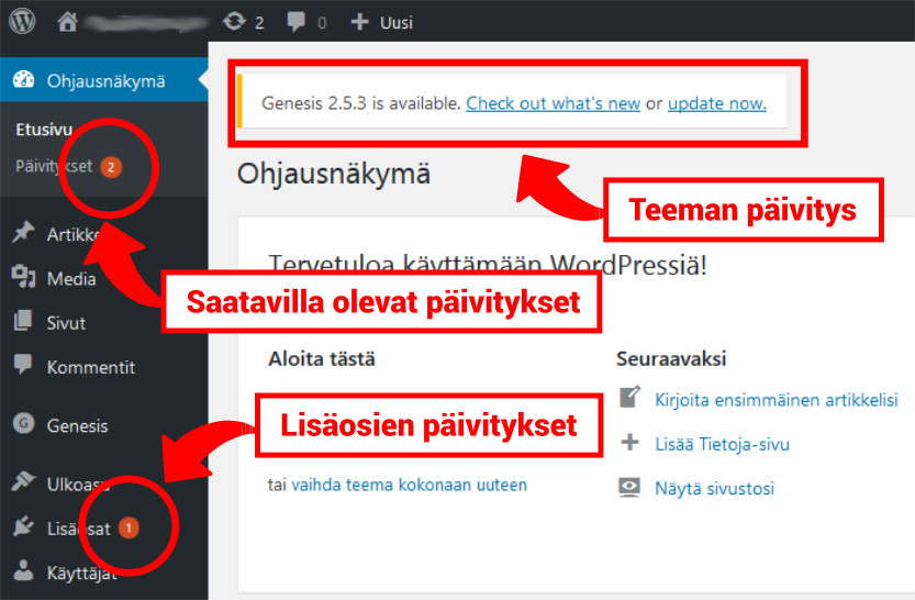 Kun kirjaudut sisään WordPress-hallintapaneliin, näet saatavilla olevat päivitykset välittömästi vasemmalla olevan päävalikon punaisina pallukoina.
