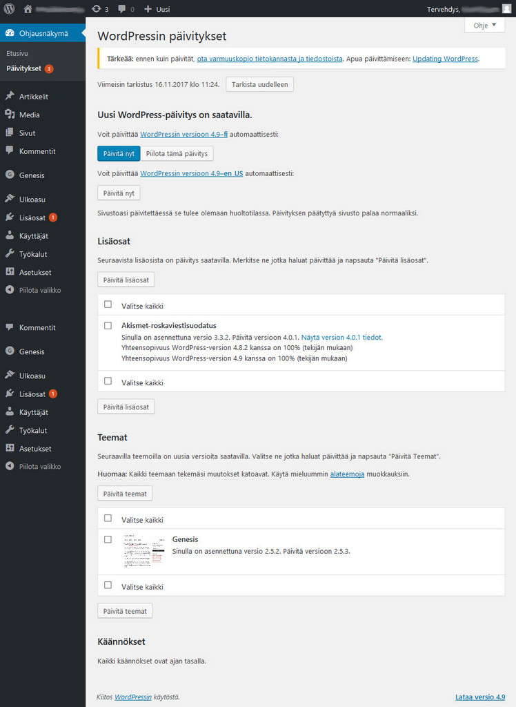 Huomaa WordPressin huomautus: “Tärkeää: ennen kuin päivität, ota varmuuskopio tietokannasta ja tiedostoista.” On siis hyvä tietää ennen päivityksen tekemistä, että sivustosta on tarpeeksi tuore varmuuskopio tallessa. Jos päivitys sattuisi menemään pieleen, sivustosi voidaan palauttaa varmuuskopiosta.